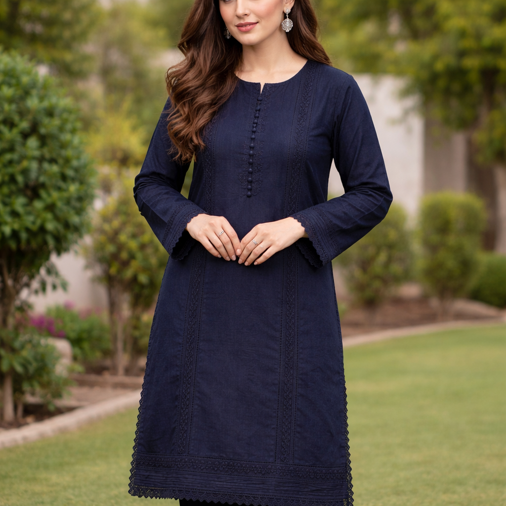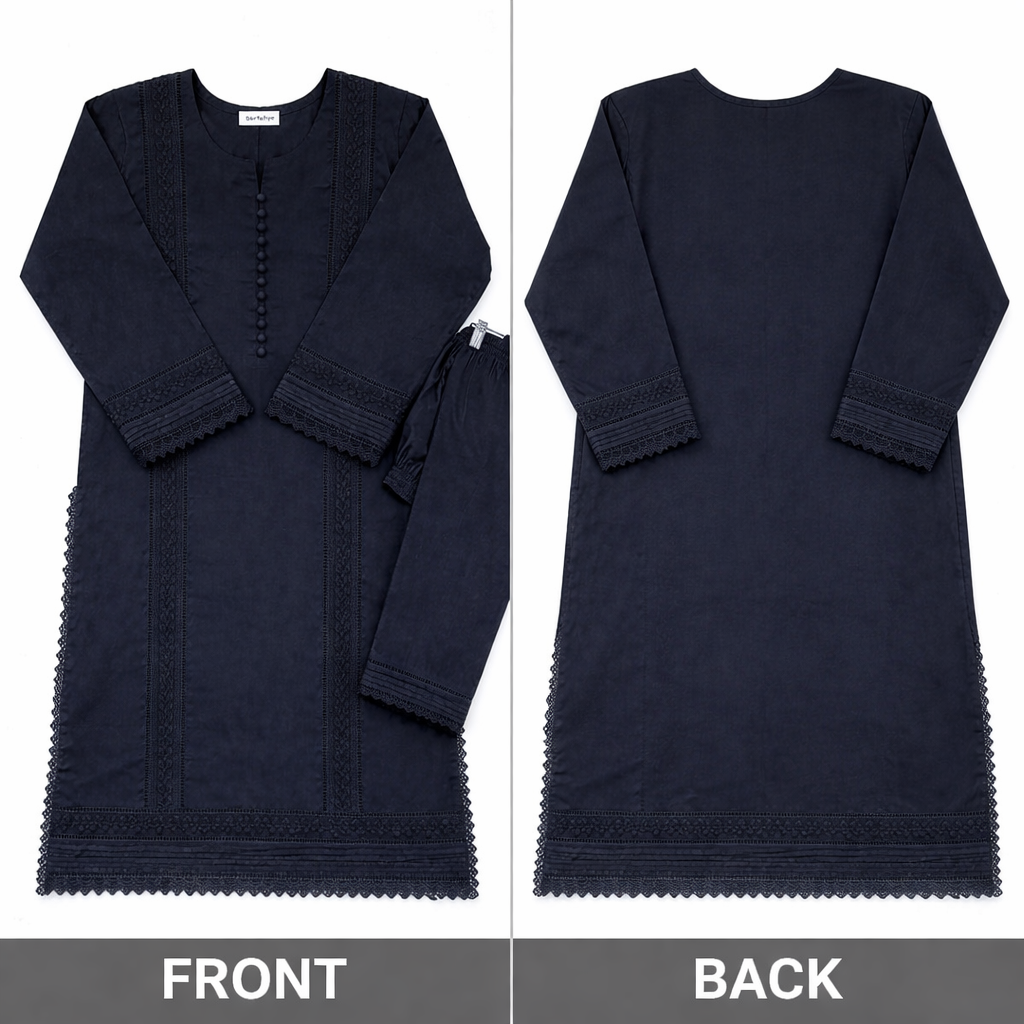 Crafted from premium lawn fabric, this suit is lightweight, breathable, and perfect for all-day wear. The front features delicate lace panels and stylish fabric buttons that enhance its overall look, while the sleeves and hem are finished with fine lace borders for a refined finish. The back is kept plain for a clean and graceful appearance.