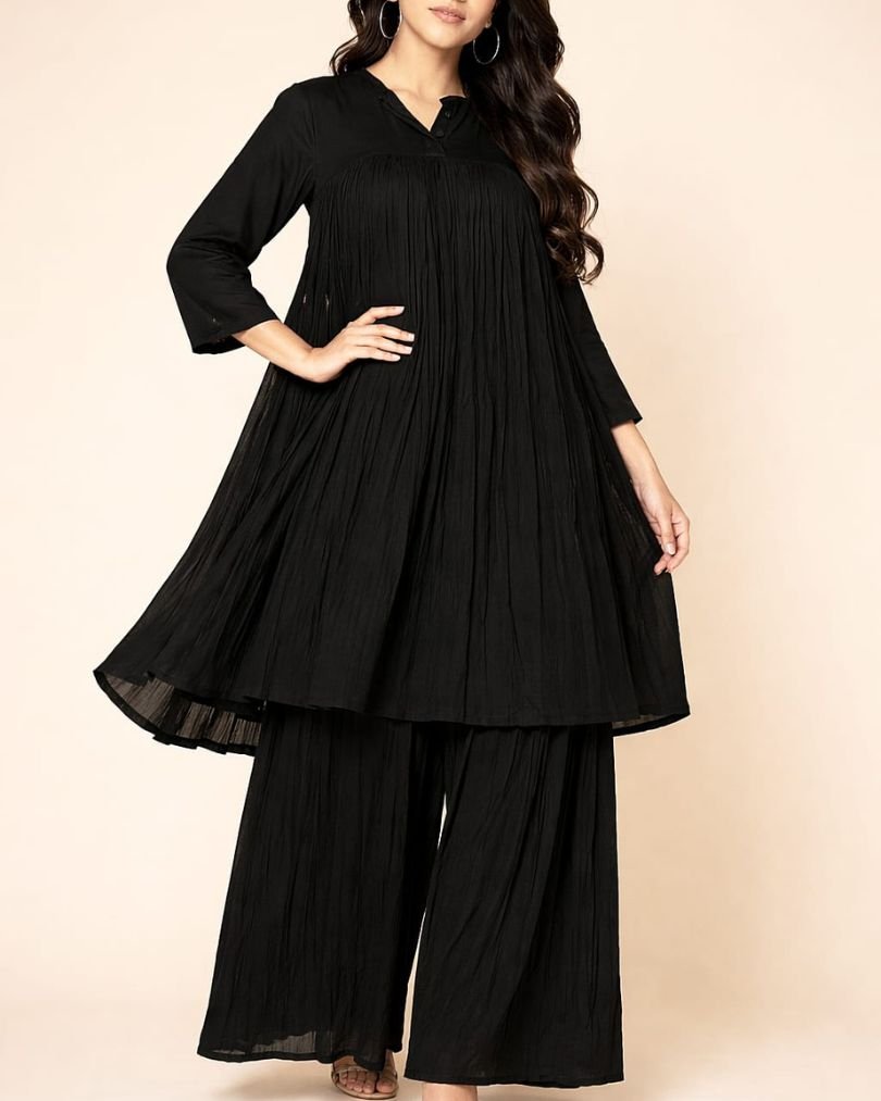 The outfit includes a flowy pleated shirt that gives a graceful fall, paired with wide-leg trousers for a trendy and relaxed fit. The classic black color makes it a versatile choice—perfect for daily wear, outings, and semi-formal events.
